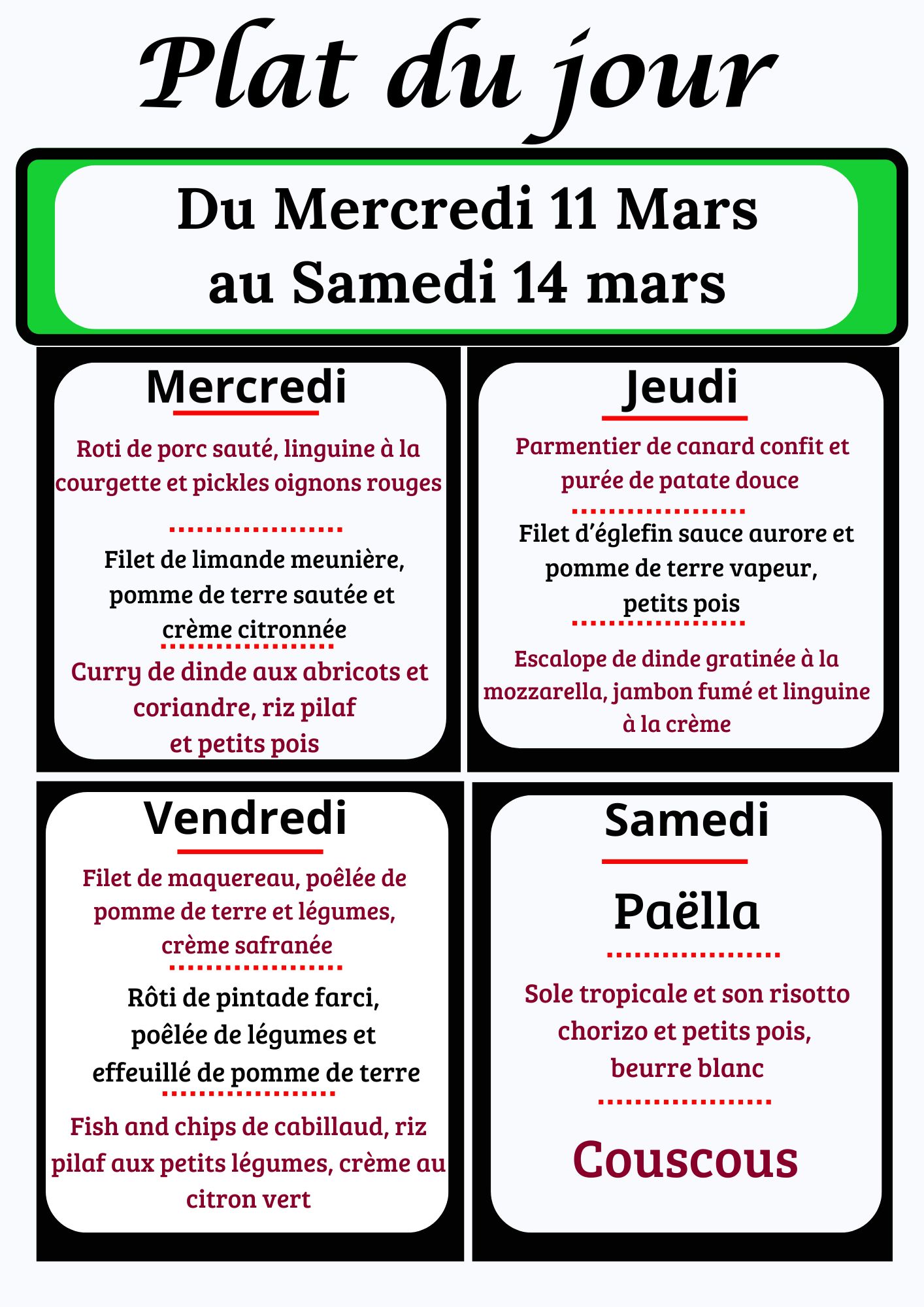 Nous vous offrons la possibilité de payer sur place via les moyens de paiement suivent chèque, carte bleue, espèce et ticket-carte restaurant