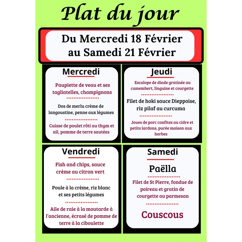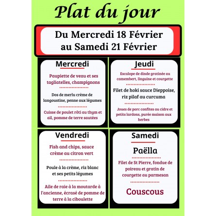 Précisez le plat du jour que vous souhaitez commander.